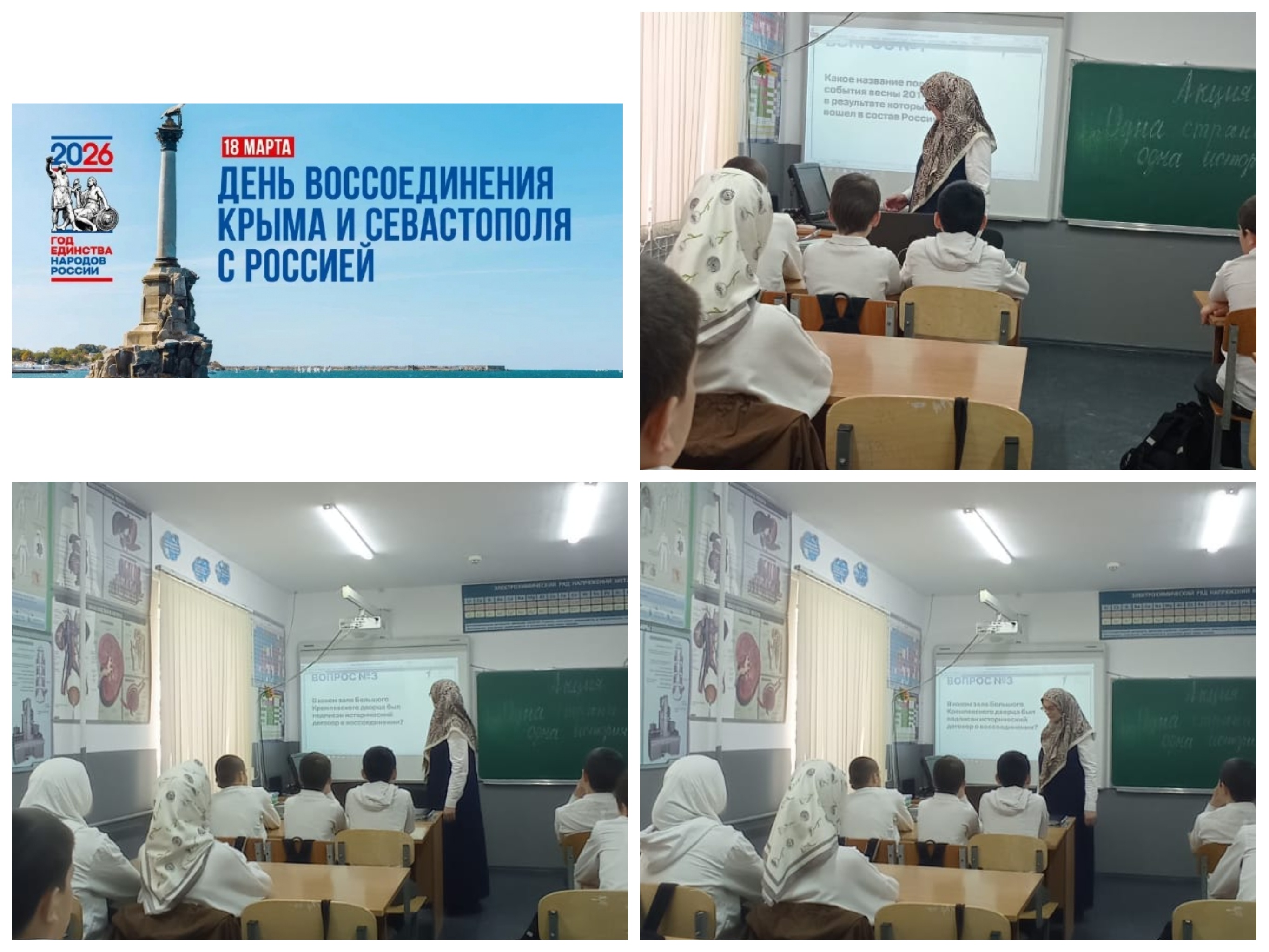 Советник директора по воспитанию и взаимодействию с детскими общественными объединениями МБОУ «СОШ№3 с.Кенхи», Сегитова Л.Д., совместно с обучающимися 5-8 классов приняли участие во всероссийской акции «Одна страна – одна история». Советник провела викторину на знание истории Крыма из 15 вопросов, разделенных по уровням сложности: от общеизвестных фактов до более сложных вопросов, требующих глубоких знаний. Целью акции стало укрепление чувства патриотизма и любви к Родине через знакомство с уникальным историческим и культурным наследием Крыма как неотъемлемой части России. Ребята отвечали на вопросы, которые охватывали период от древности до современности: от греческого названия Симферополя до даты подписания договора о воссоединении в Георгиевском зале Большого Кремлевского дворца. Некоторые вопросы, которые вызвали наибольший интерес: